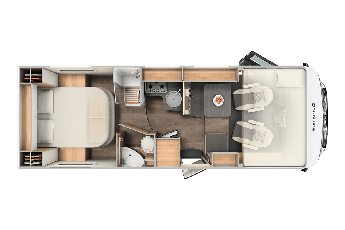 The Sunlight I69 is a 7.4m A-Class motorhome, equipped as standard with four seat belts and sleeping space for four, with the option to accommodate up to five.