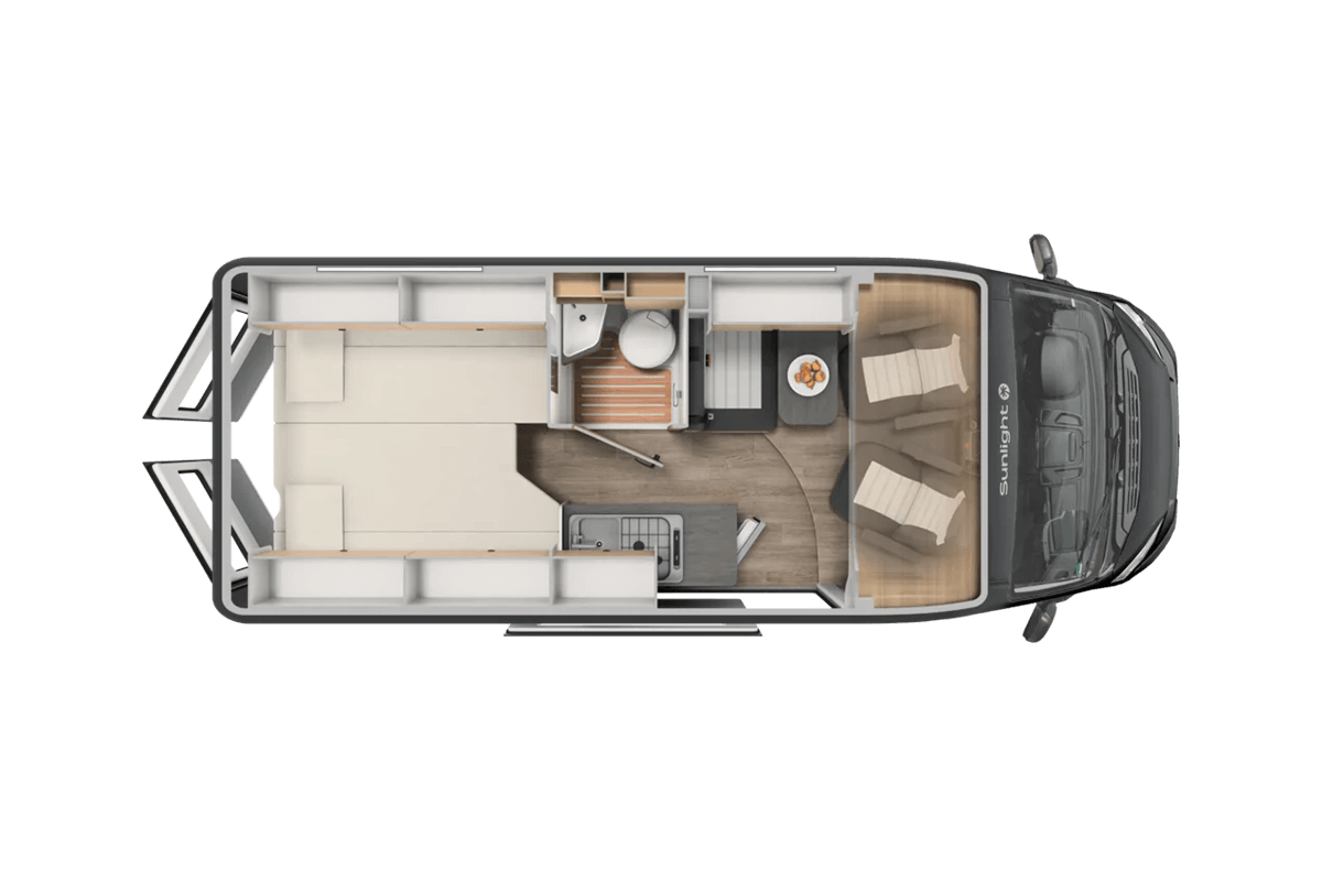 The 6.0m Sunlight Cliff 602 is a versatile 2-5 berth motorhome, featuring a fixed rear double bed with optional extras including a pop top roof and additional lounge bed. Unlike most 6.0m vehicles the Sunlight Cliff 602 comes standard with longitudinal beds rather than the transverse bed, so there’s no need to climb over your partner during those late-night trips!