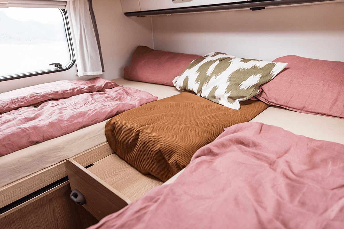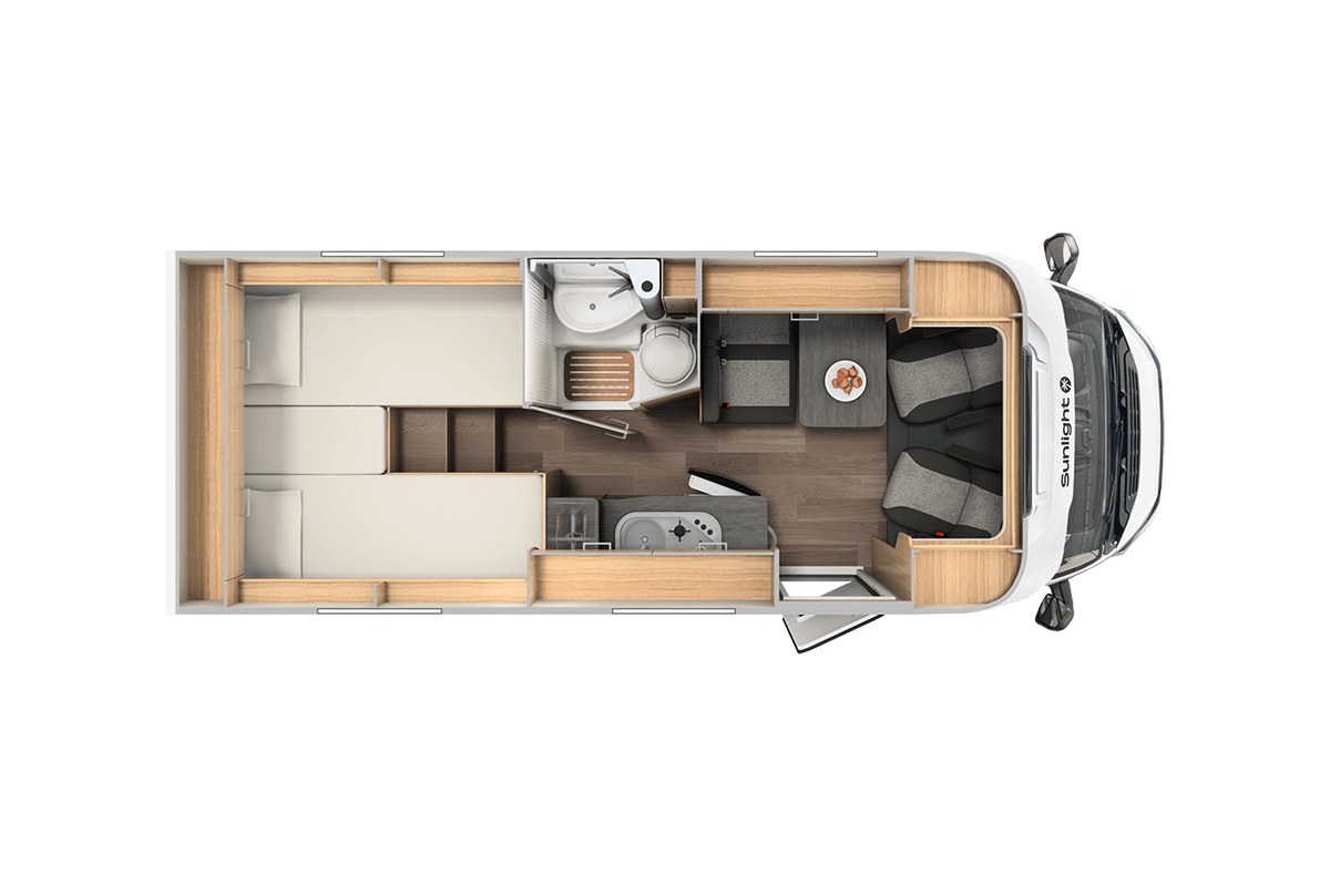 The 6.64m Sunlight V66 is a 2 berth motorhome with fixed rear bed which can be used as 2 single beds or easily made into a large double.