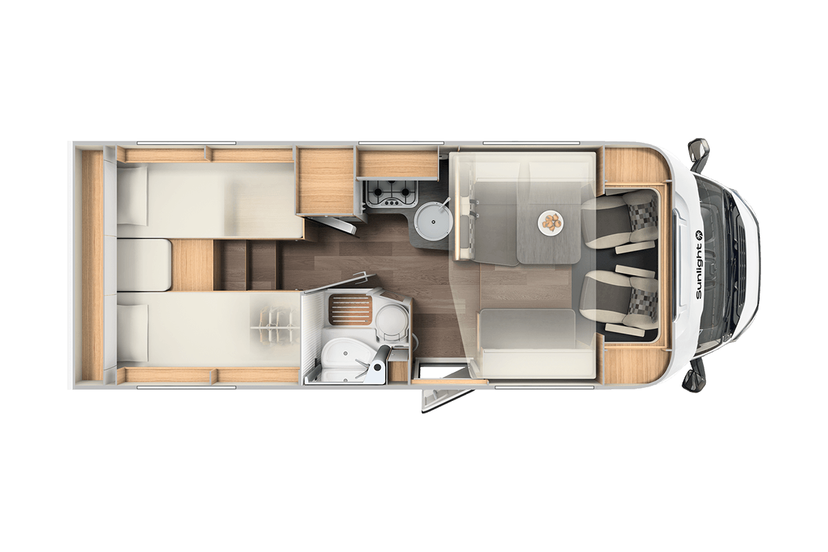 The Sunlight T67 Adventure Edition is a spacious, semi integrated campervan, suitable for up to 5 people. You will find single beds at the rear that convert into a double bed. It also features an optional pull down bed and a bed conversion for the lounge area. You will find a modern bathroom with a combined shower, toilet and sink. The kitchen boasts a 3 gas burner hob, oven and large fridge/freezer.