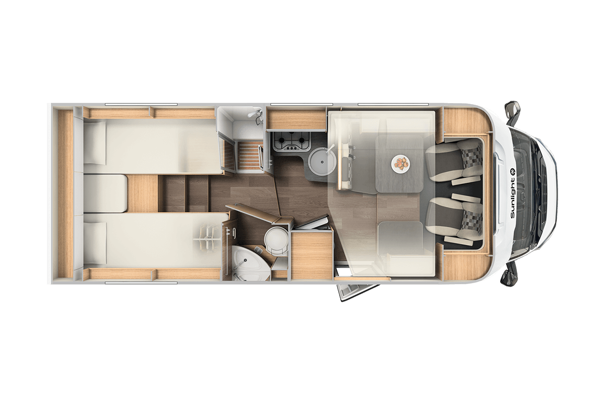 The Sunlight T68 Adventure Edition is a spacious, semi integrated campervan, suitable for up to 5 people. You will find single beds at the rear that convert into a double bed. It also features an optional pull down bed. You will find a modern bathroom with toilet and sink, with the separate shower on the opposite wall. The kitchen boasts a 3 gas burner hob, oven and large fridge/freezer.