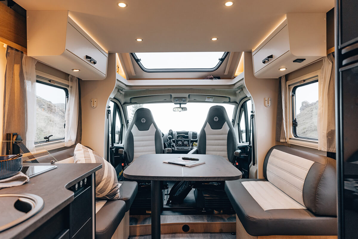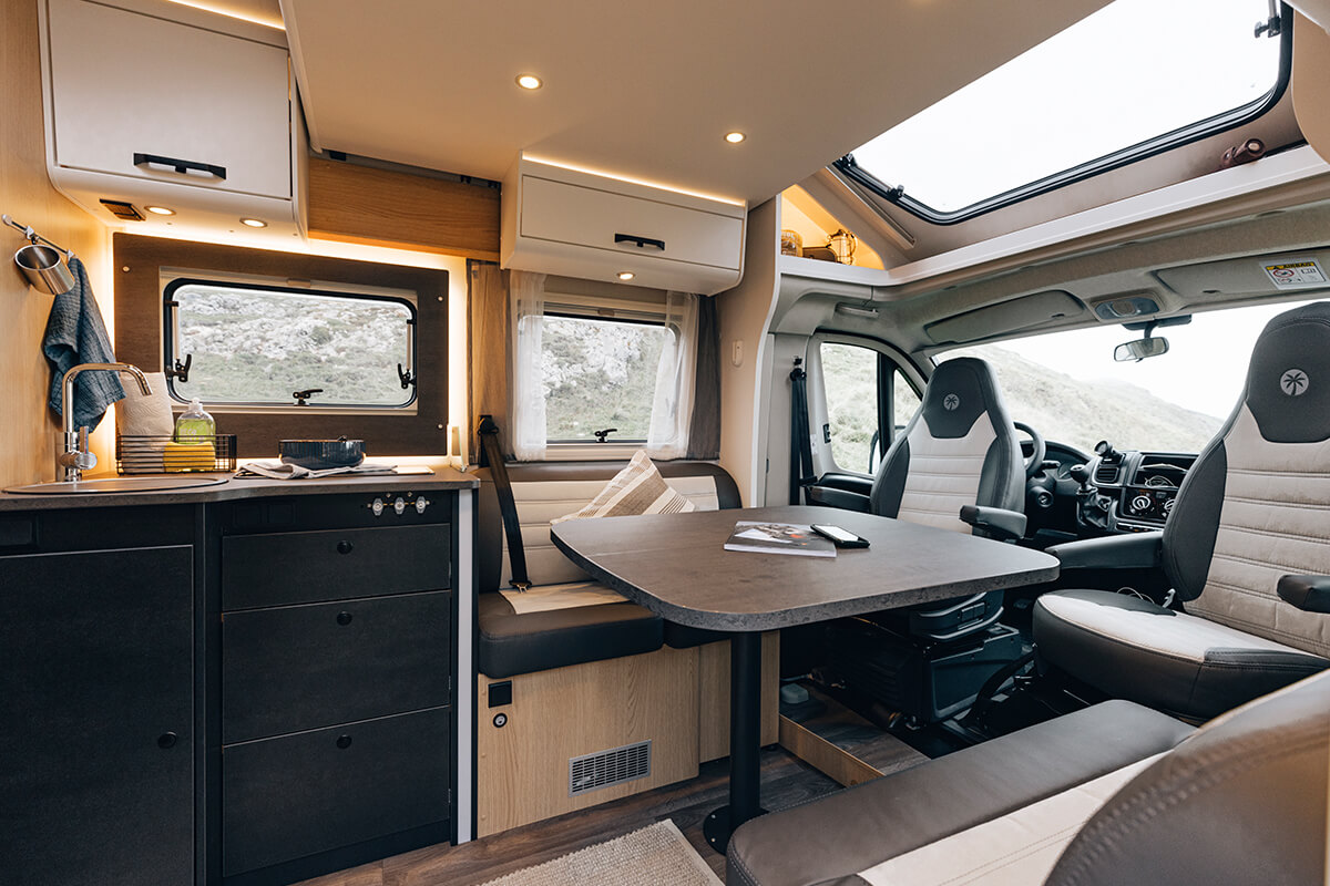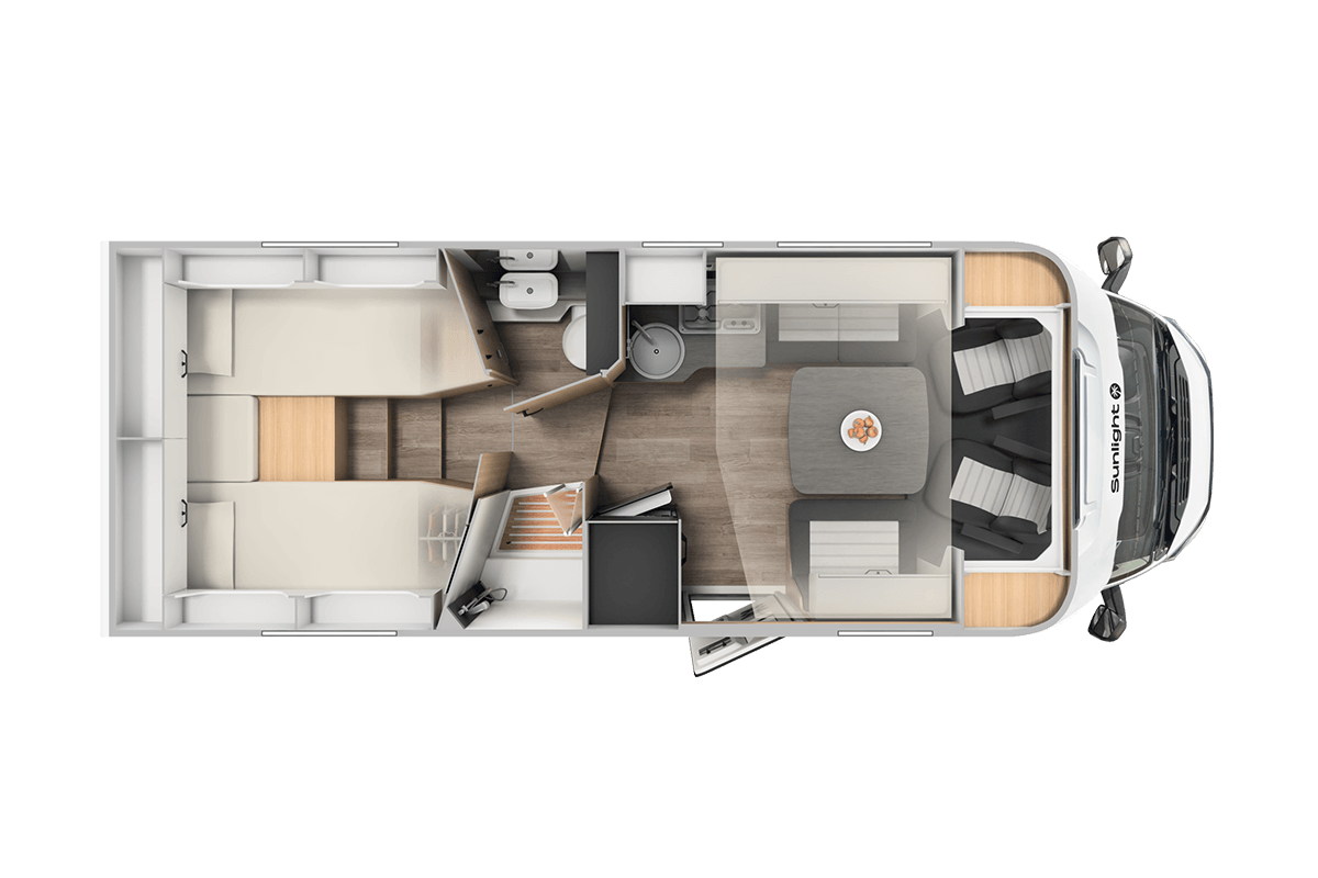 The Sunlight T68C Adventure Edition is a spacious, semi integrated campervan, suitable for up to 5 people. You will find single beds at the rear that convert into a double bed. It also features a large double lounge area with an optional pull down bed.