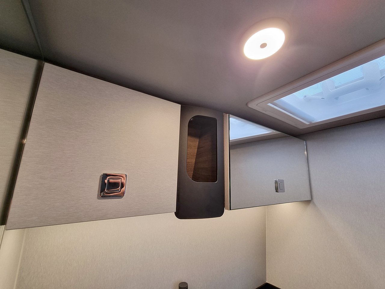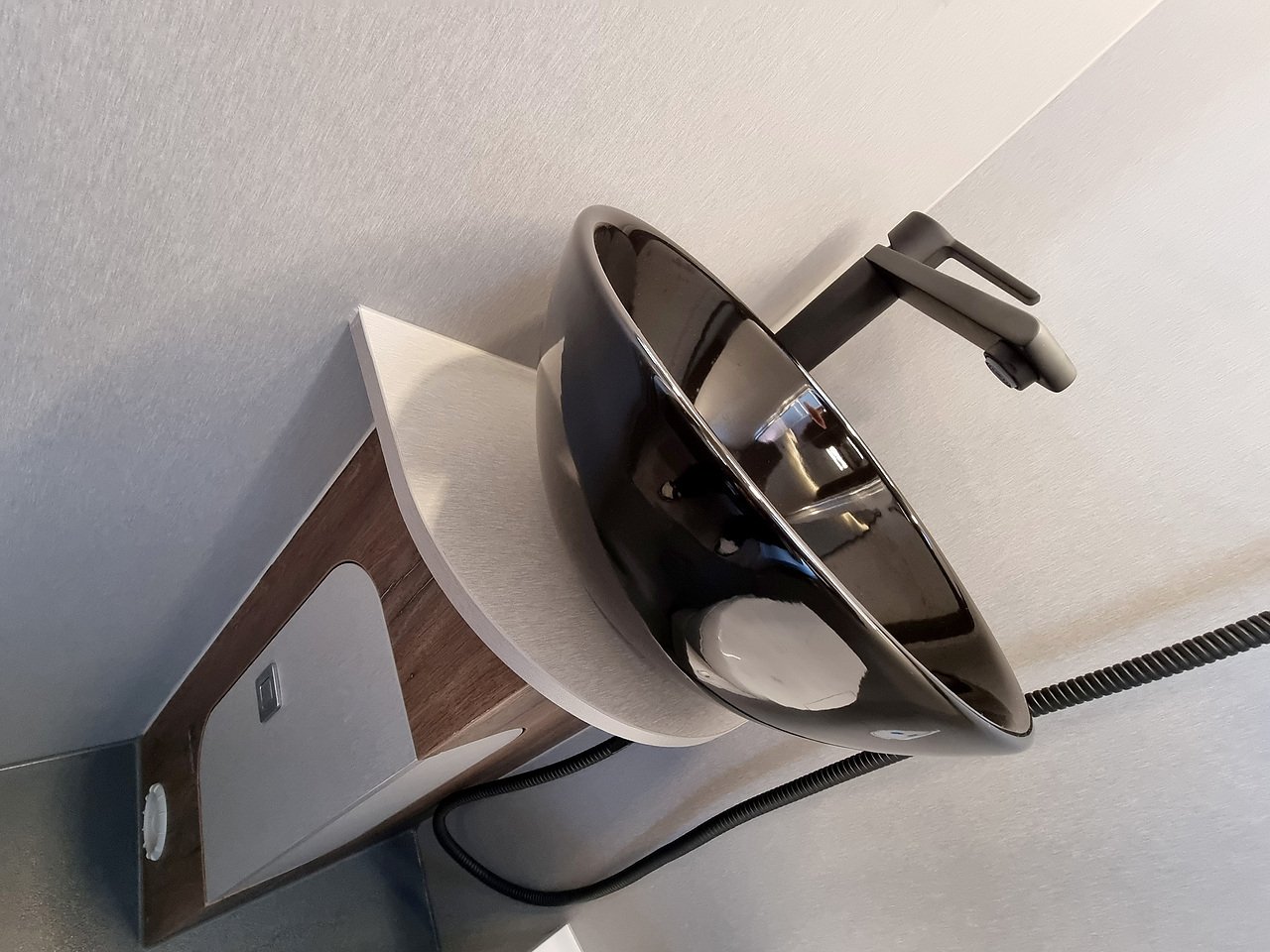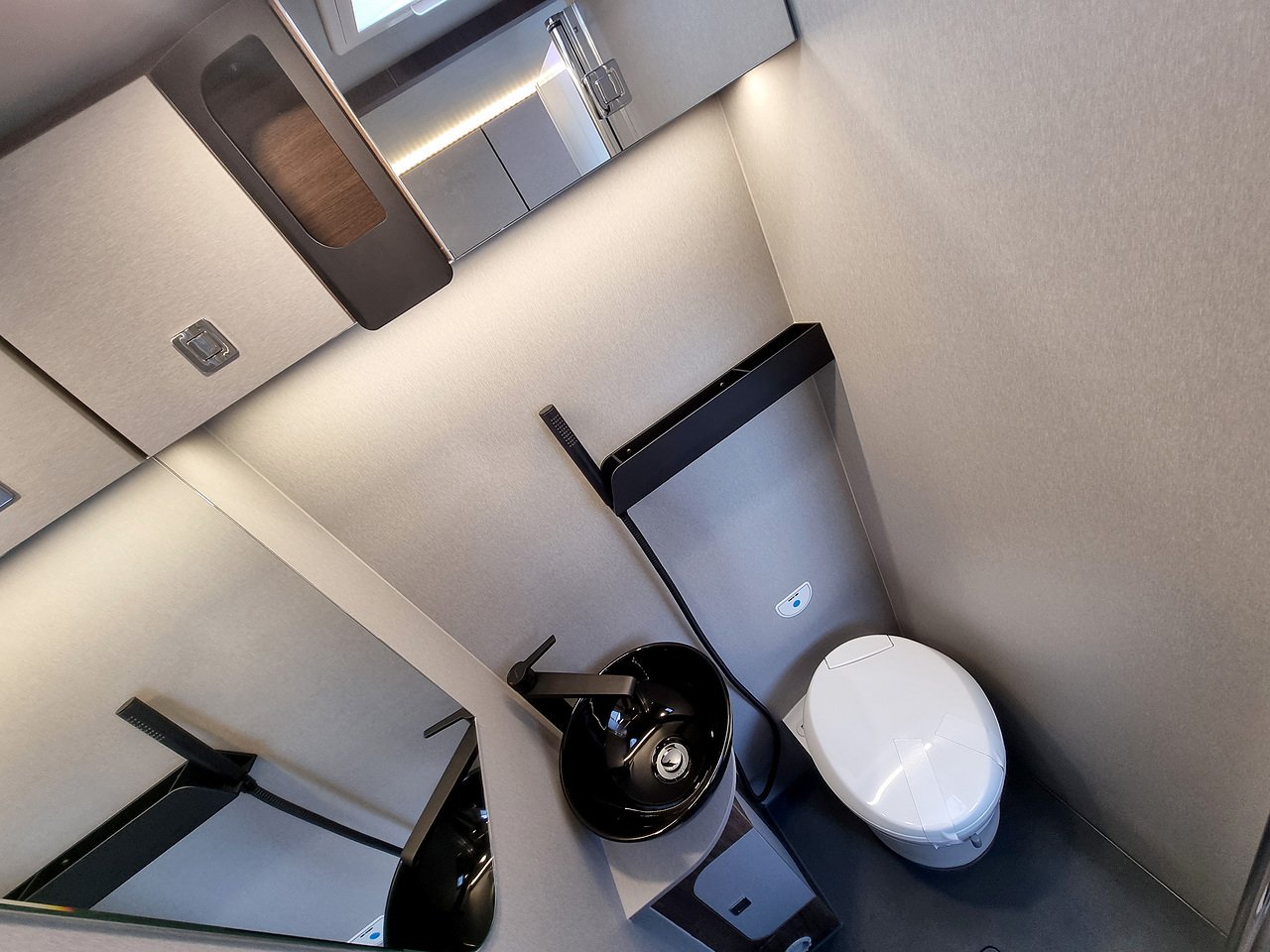 The washroom contains a ceramic sink dometic toilet and an innovative 180 degree bi-folding glass door on the washroom.