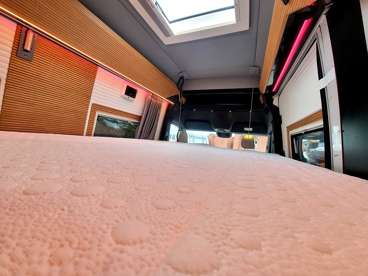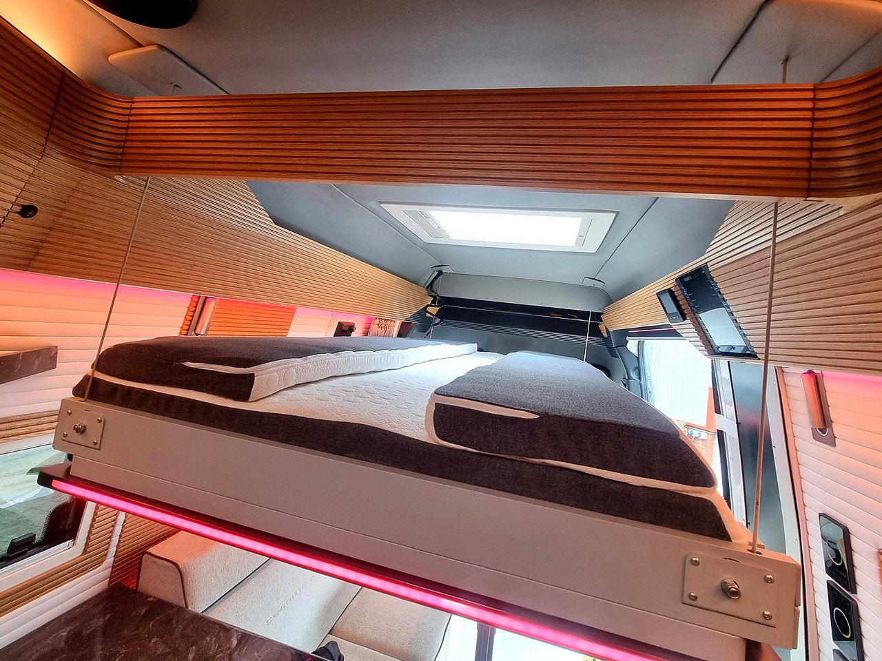 This 2 berth van conversion is just over 7m and has a 2.0, four cylinder engine with automatic gearbox and 190bhp. You won’t find a classic bed in the Schumacher Edition. There is an electric lift up bed that floats! It is attached to the ceiling structure with 4-point steel cables and as it drops down it also extends.