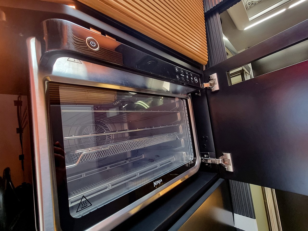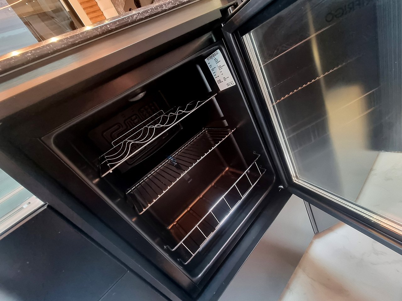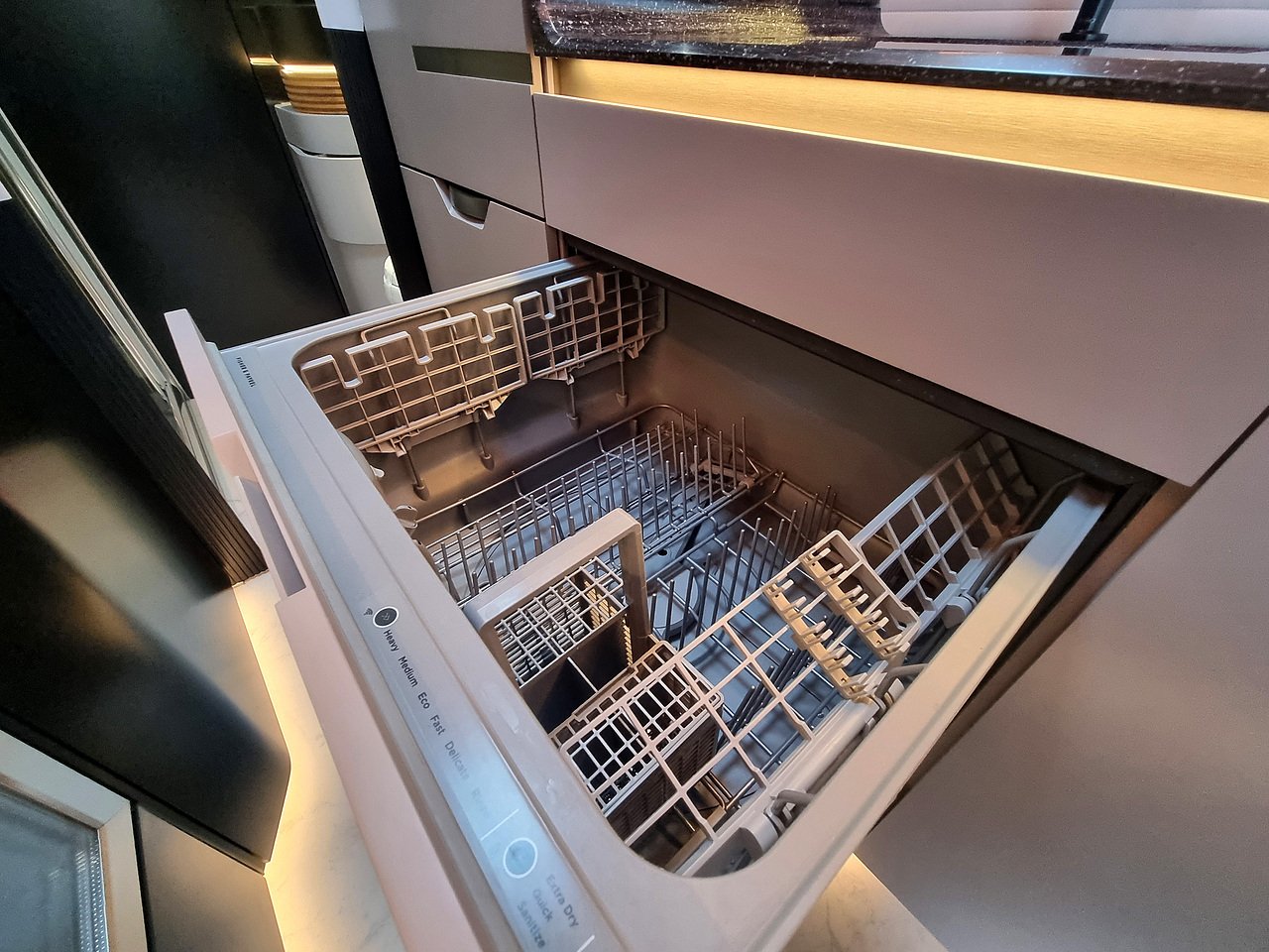 The kitchen in the Robeta Schumacher is full of hidden corners and storage. You will find a modern induction hob, 150L slimline fridge, dishwasher & even a separate wine cooler! And don’t forget your 4 legged friend, they will have their own built in bed, food and water bowls.
