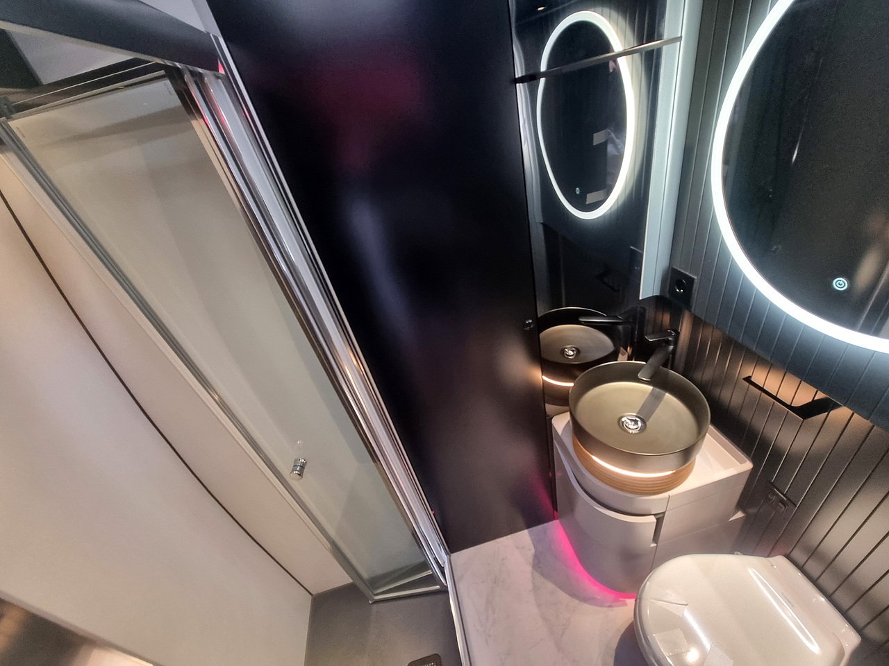 The washroom has a feeling of spaciousness you don’t expect in a motorhome. The Schumacher Edition boasts a private shower with glass partition, black sink, ceramic toilet and large illuminated mirror.