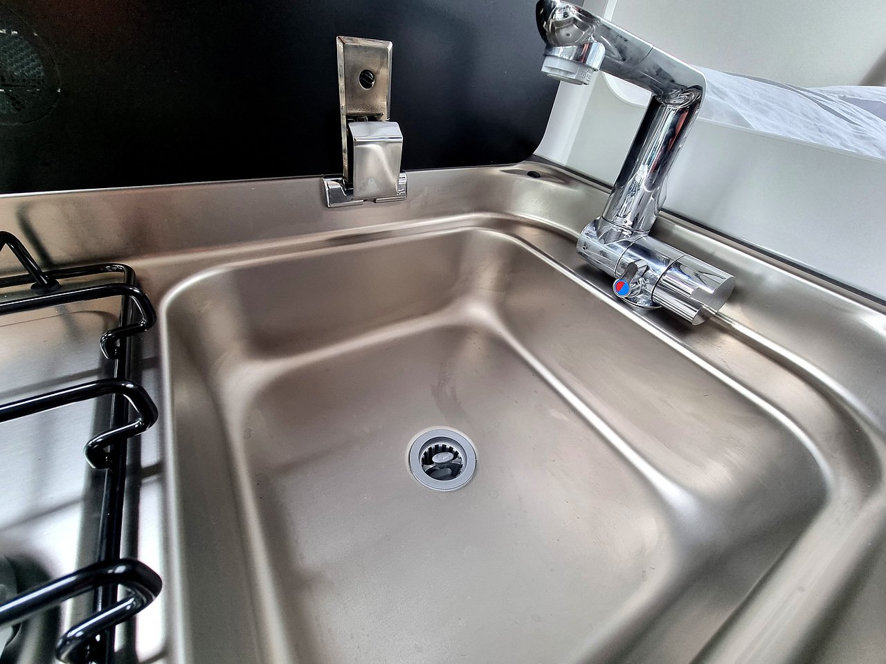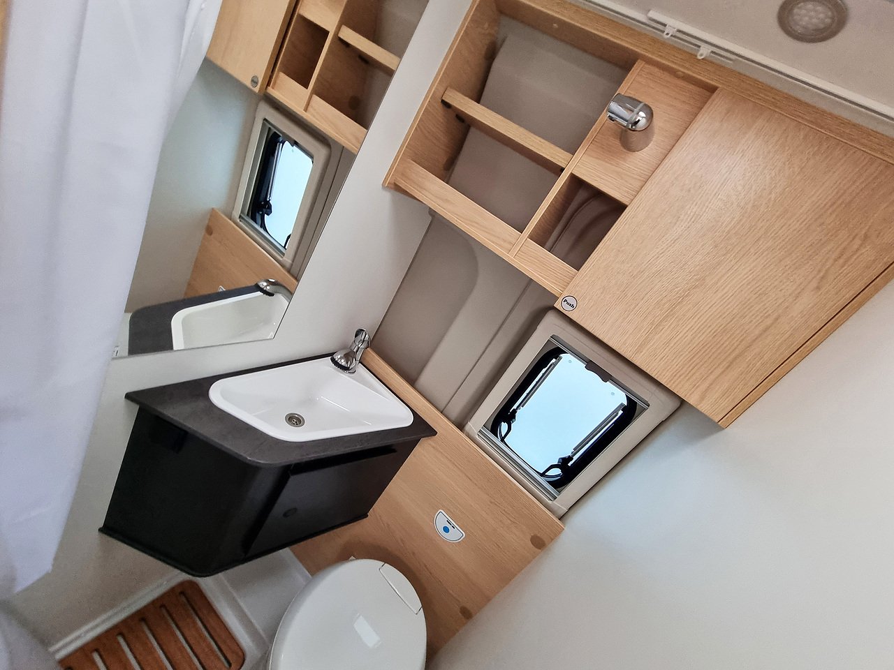 Opposite the kitchen, you will find the bathroom including cassette toilet, sink, mirror & shower.