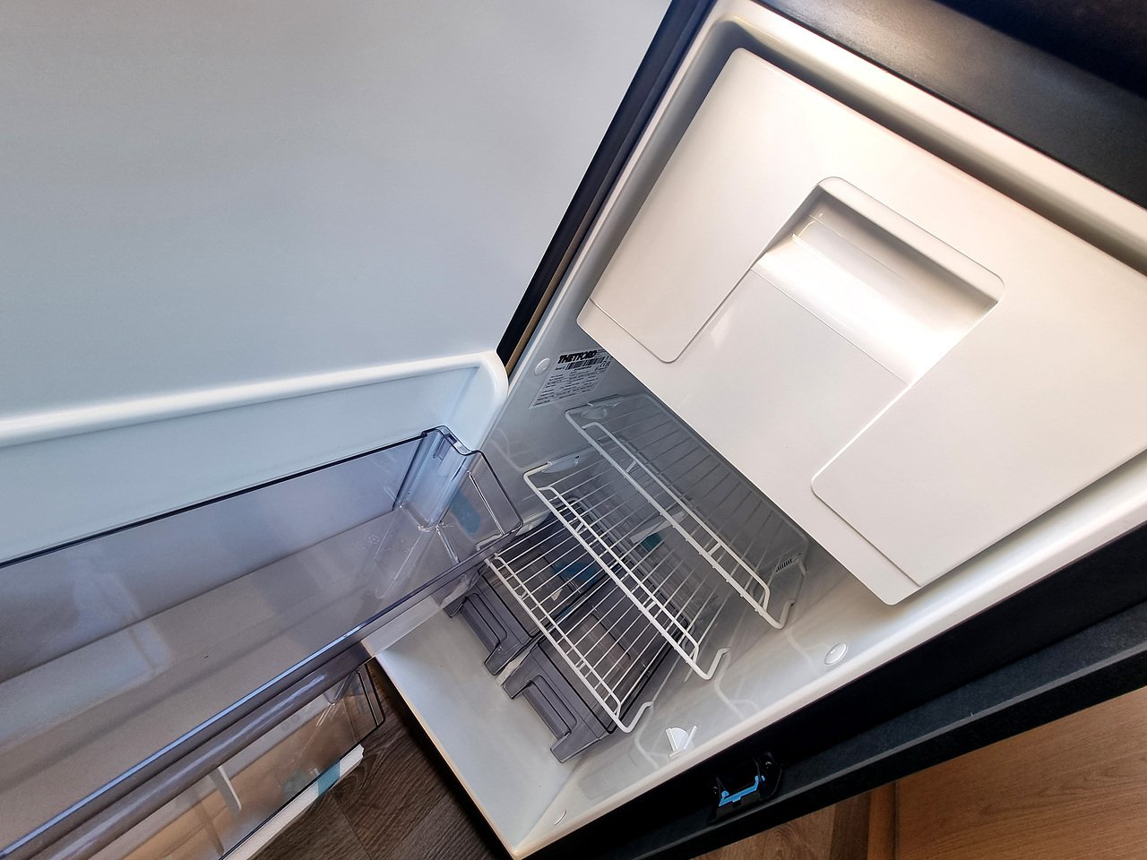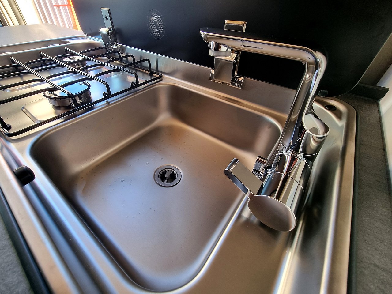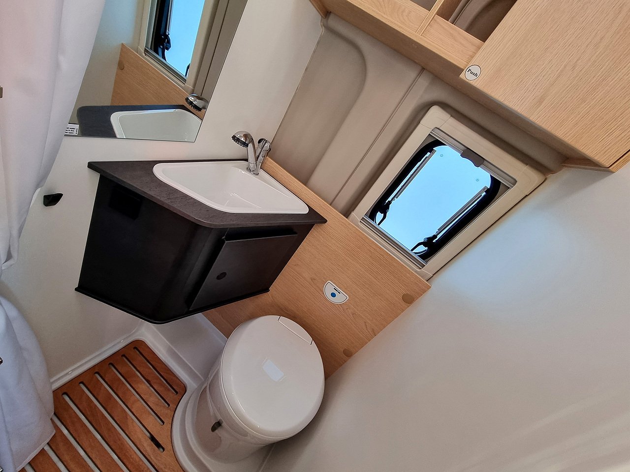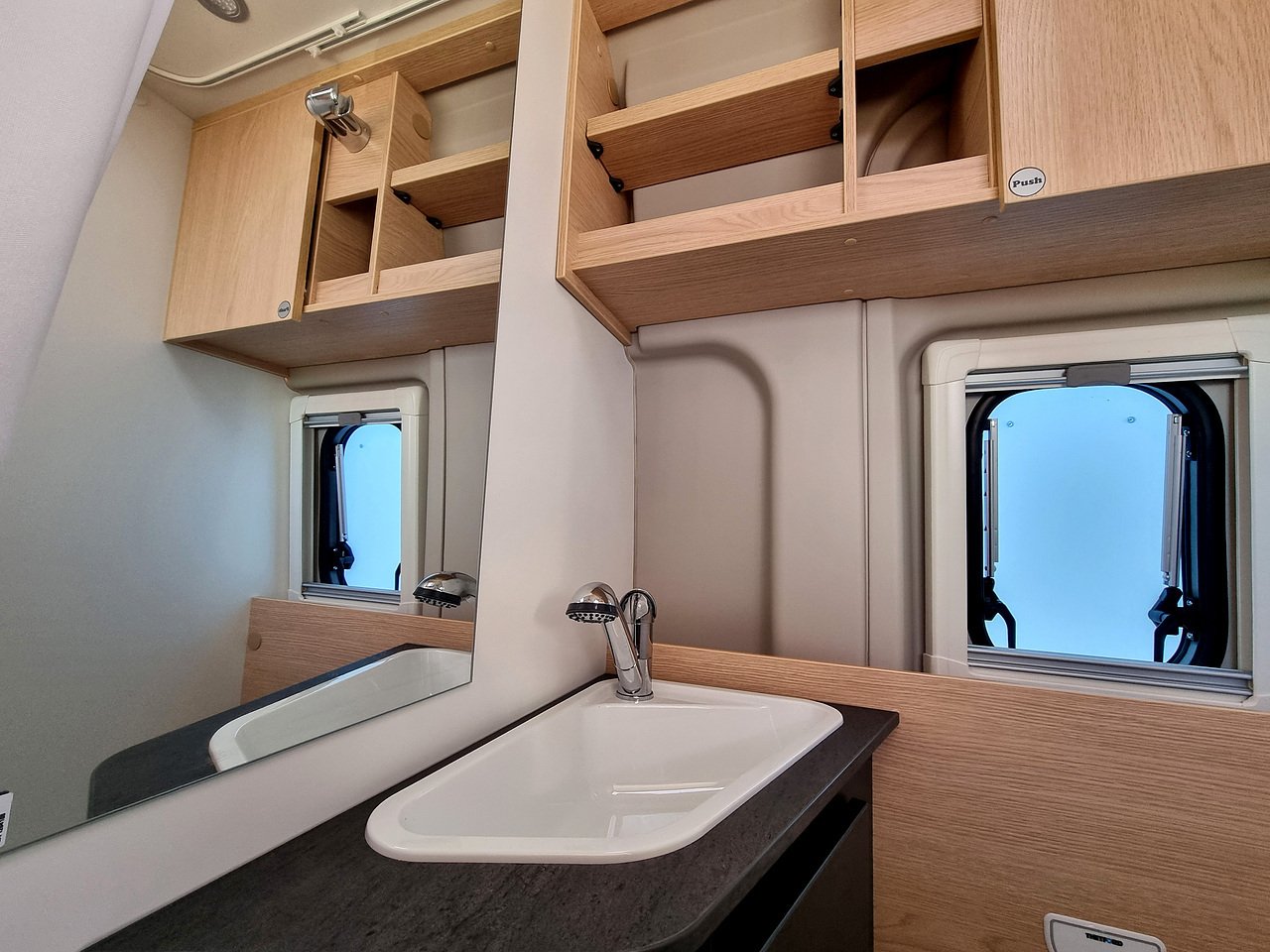 Opposite the kitchen, you will find the bathroom including cassette toilet, sink, mirror & shower.