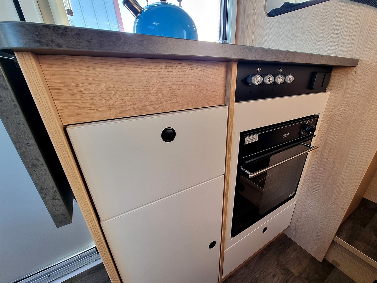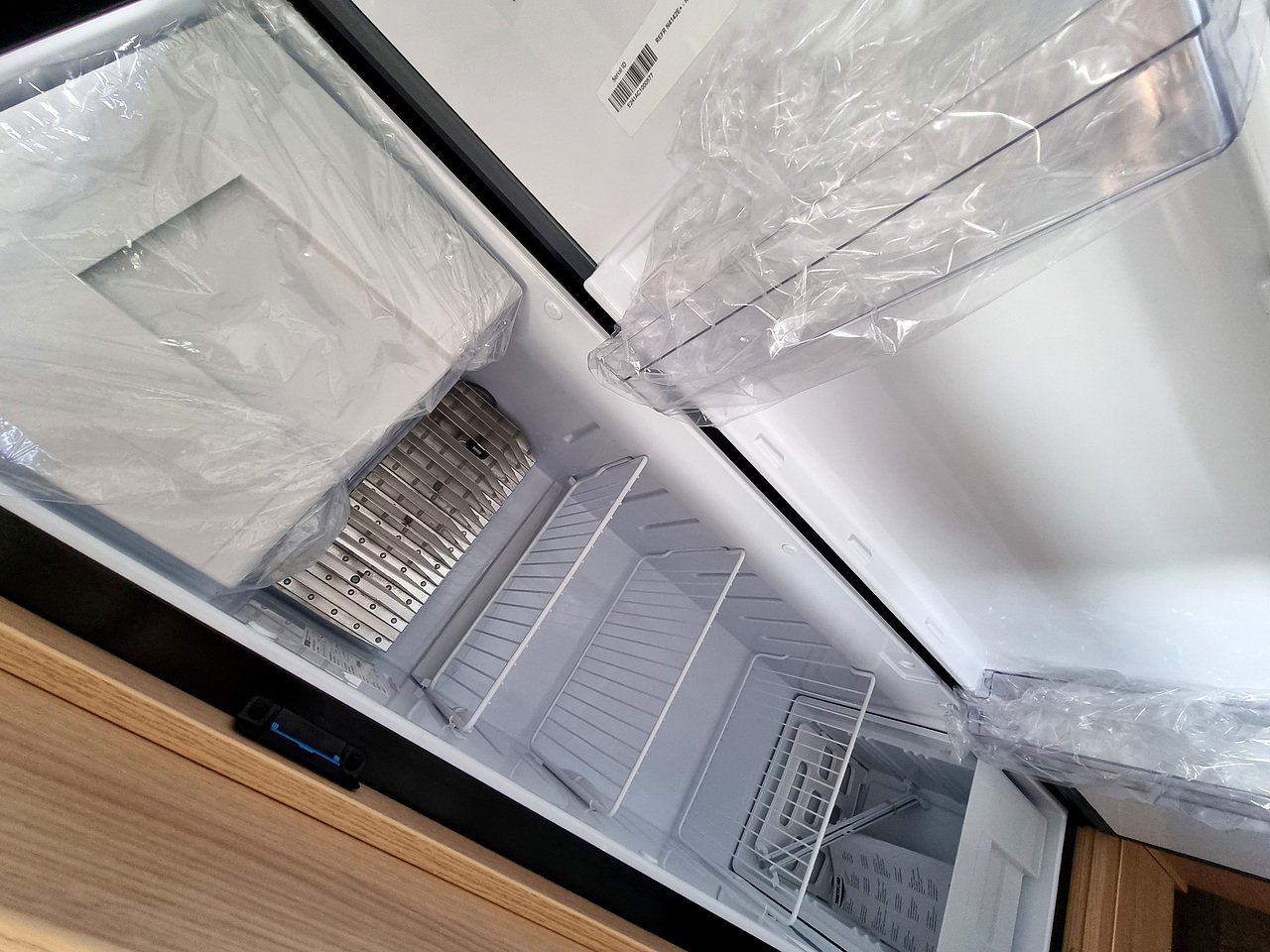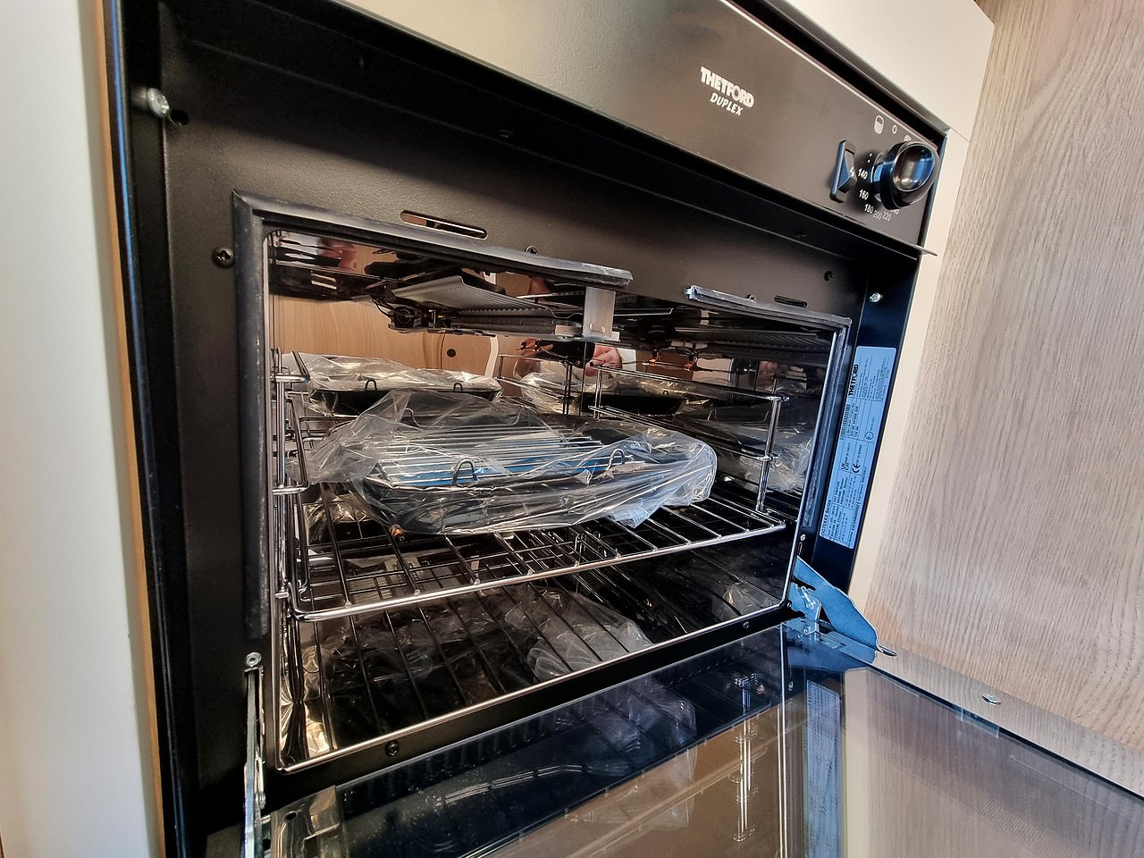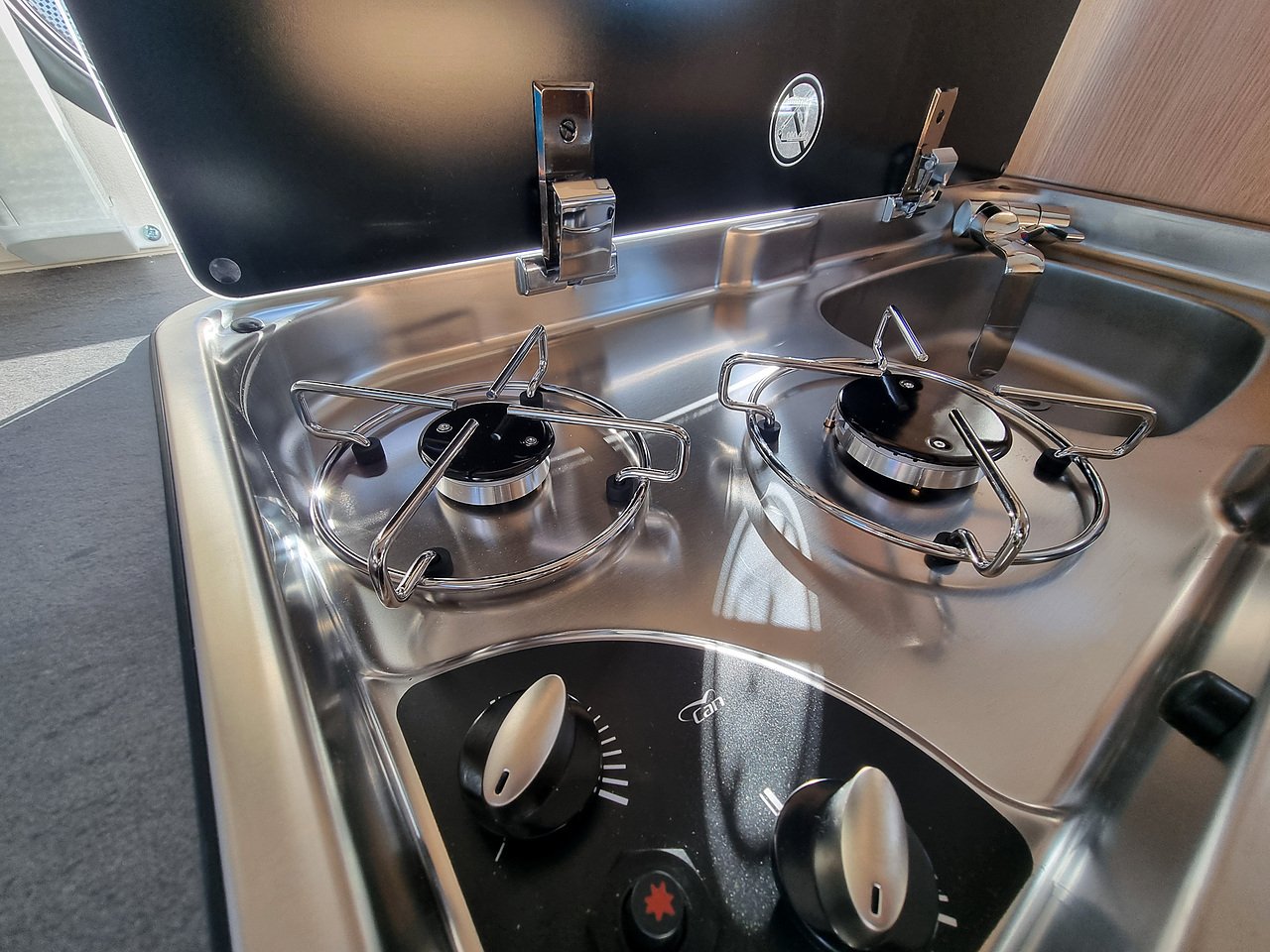 The kitchen area has a 2 gas burner hob, oven and large 137L fridge with freezer compartment.